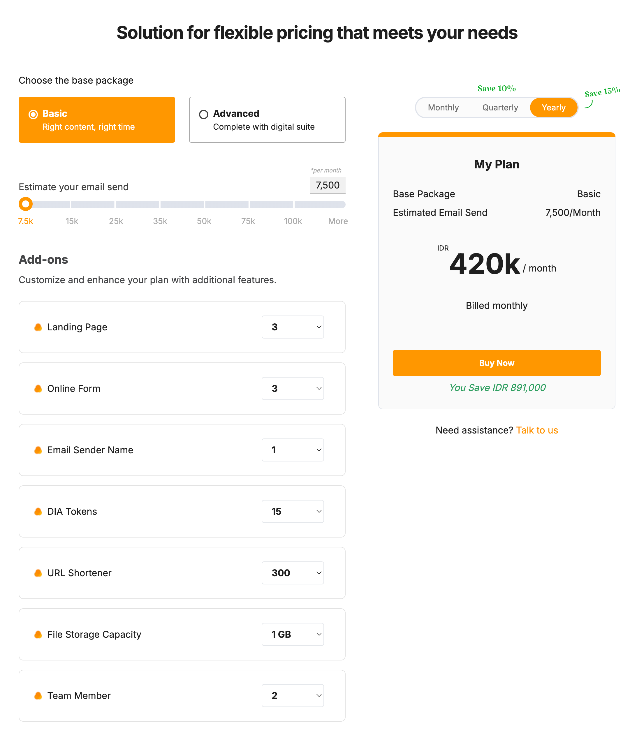 We provide flexible pricing solutions tailored to your needs through Basic and Advanced pricing packages. Each package is designed to meet your email marketing needs, from email delivery to more comprehensive digital suite features. You can also add additional features (add-ons) based on your business requirements, making the package you choose truly customizable.