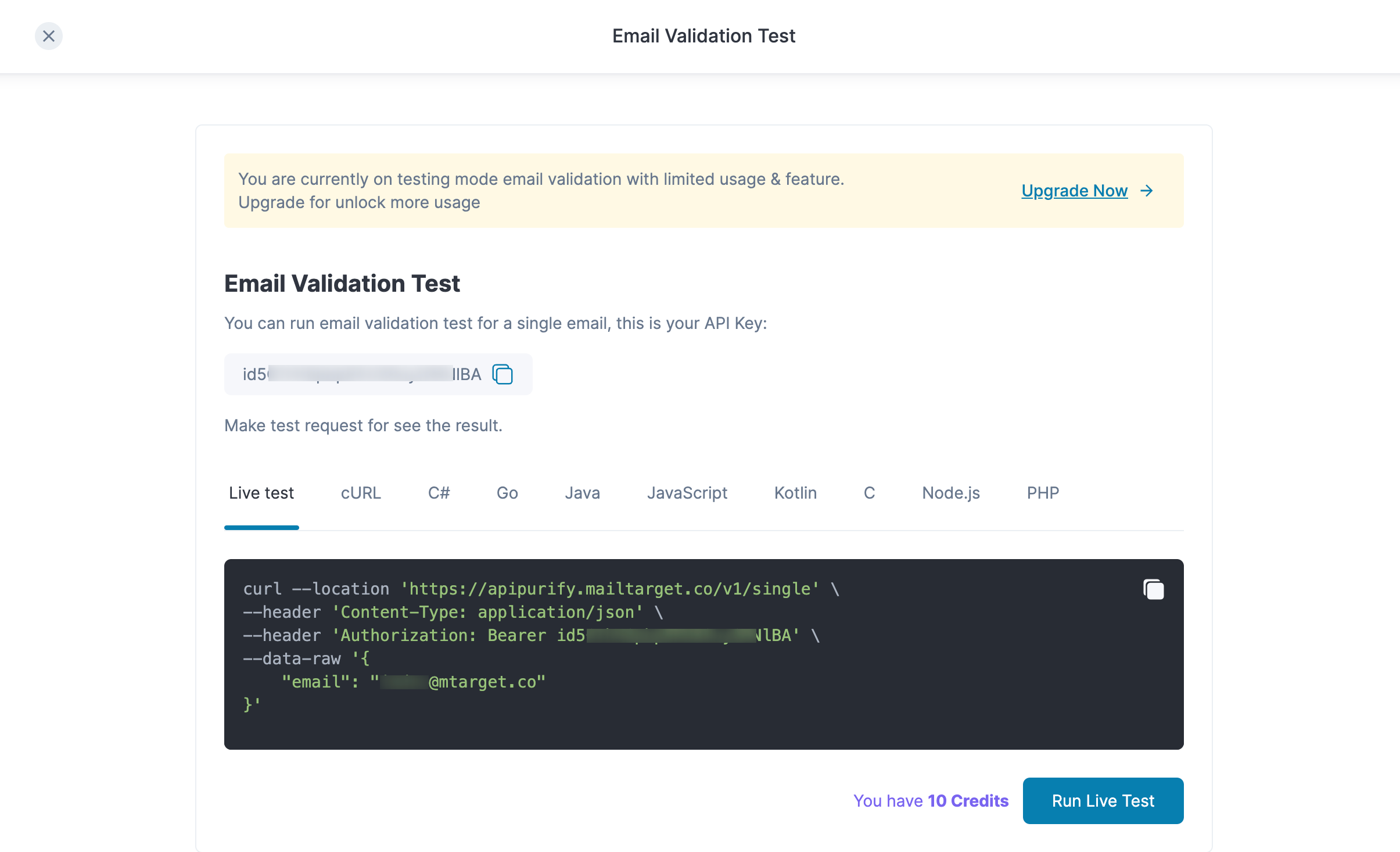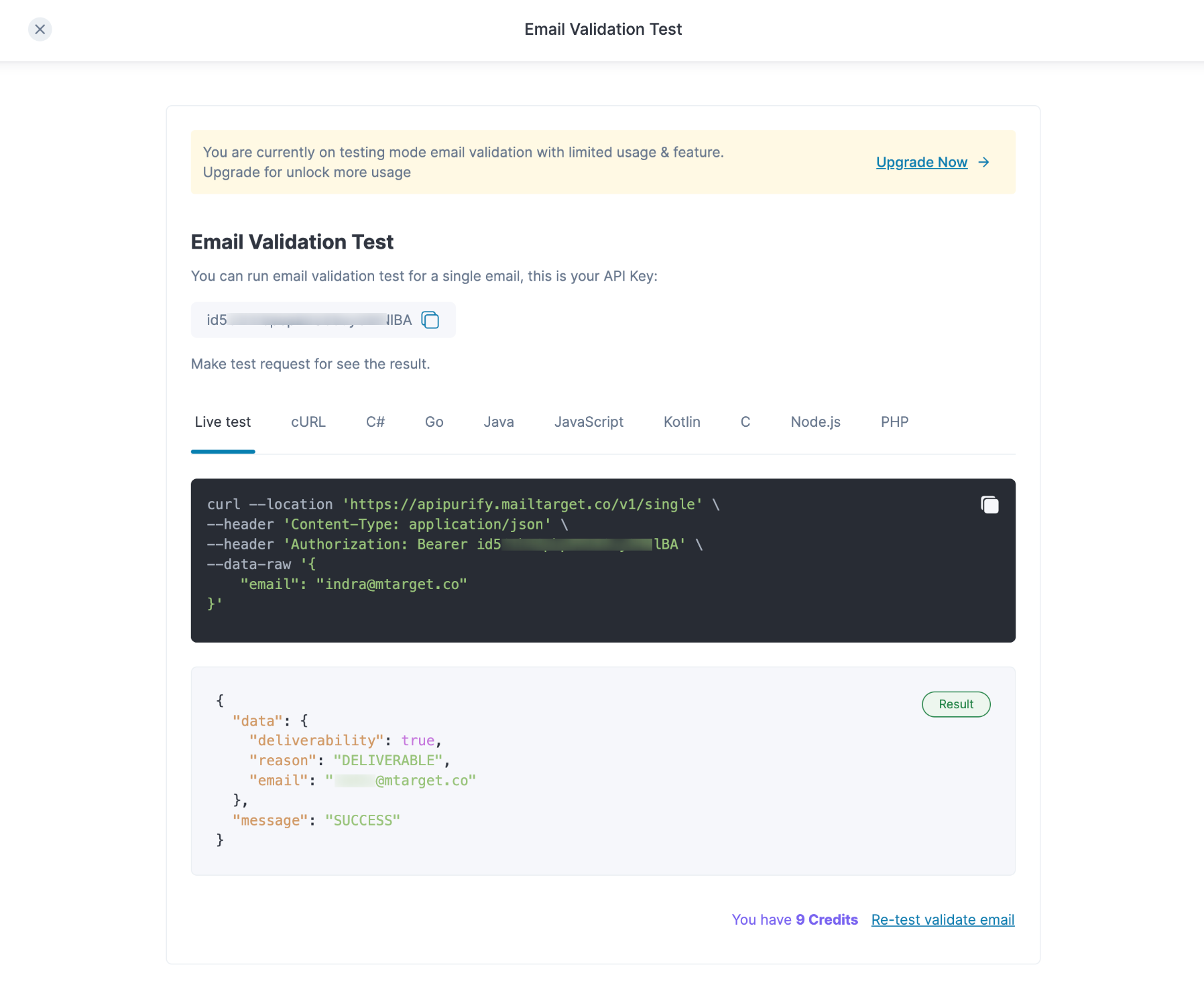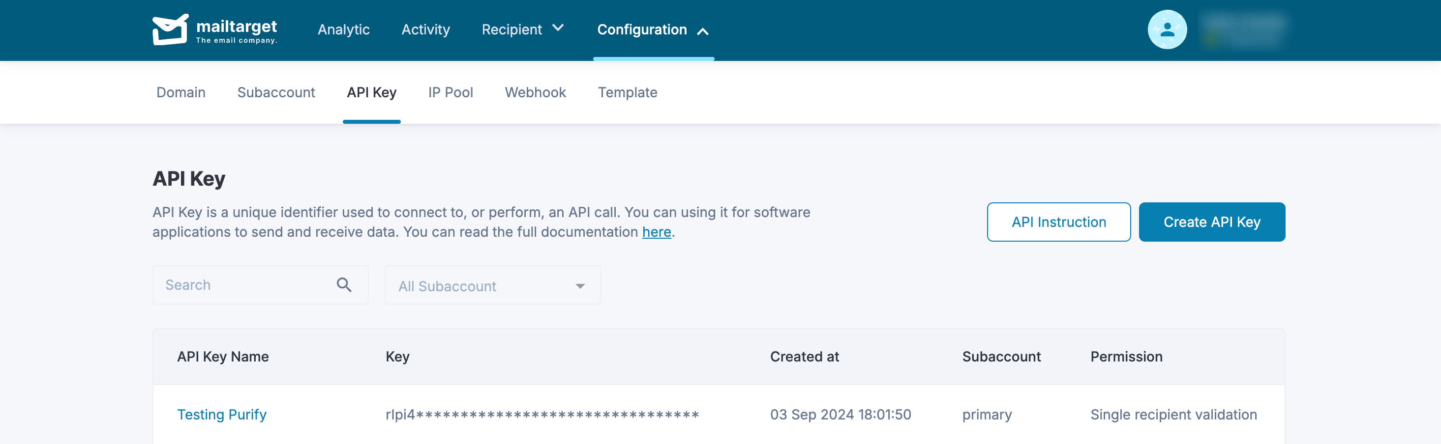 The generated Purify Key will be listed on the API Key page and is ready for use in single validation.