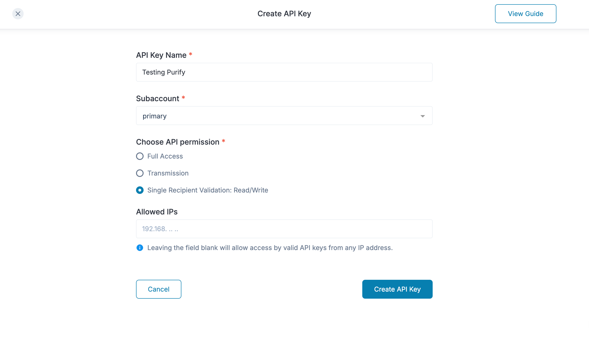 Enter the API Key Name, select the Subaccount, and choose API Permission as Single Recipient Validation: Read/Write. Click Create API Key and save the key.