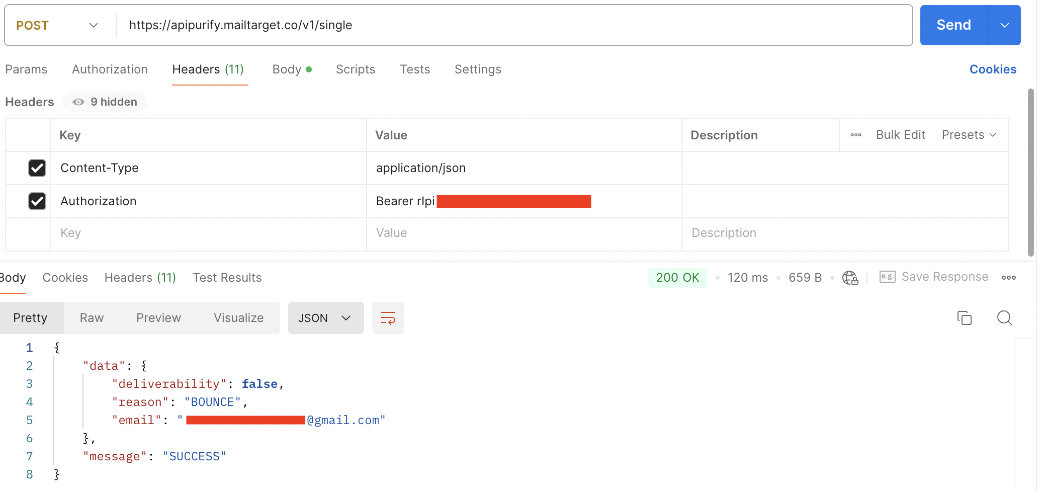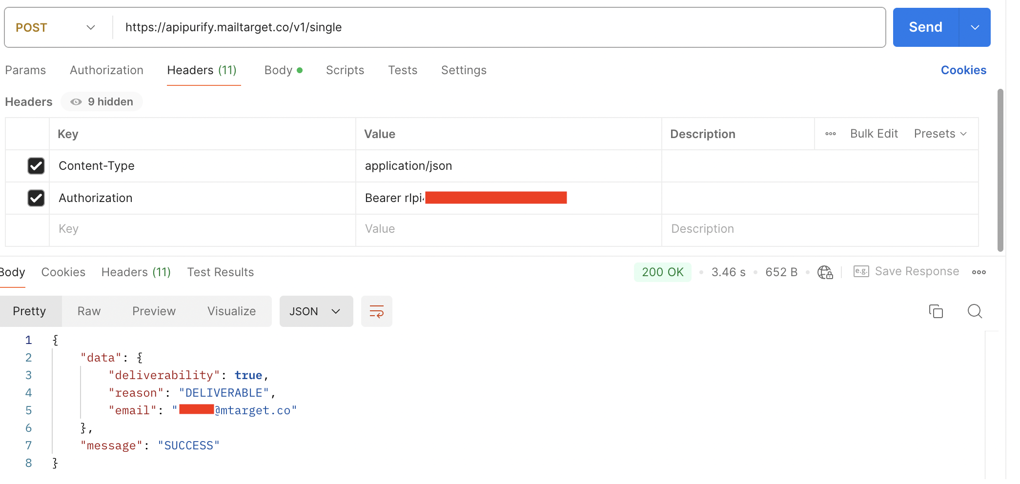 If the validation is successful, the "deliverability" data will be true and the reason will be DELIVERABLE.
