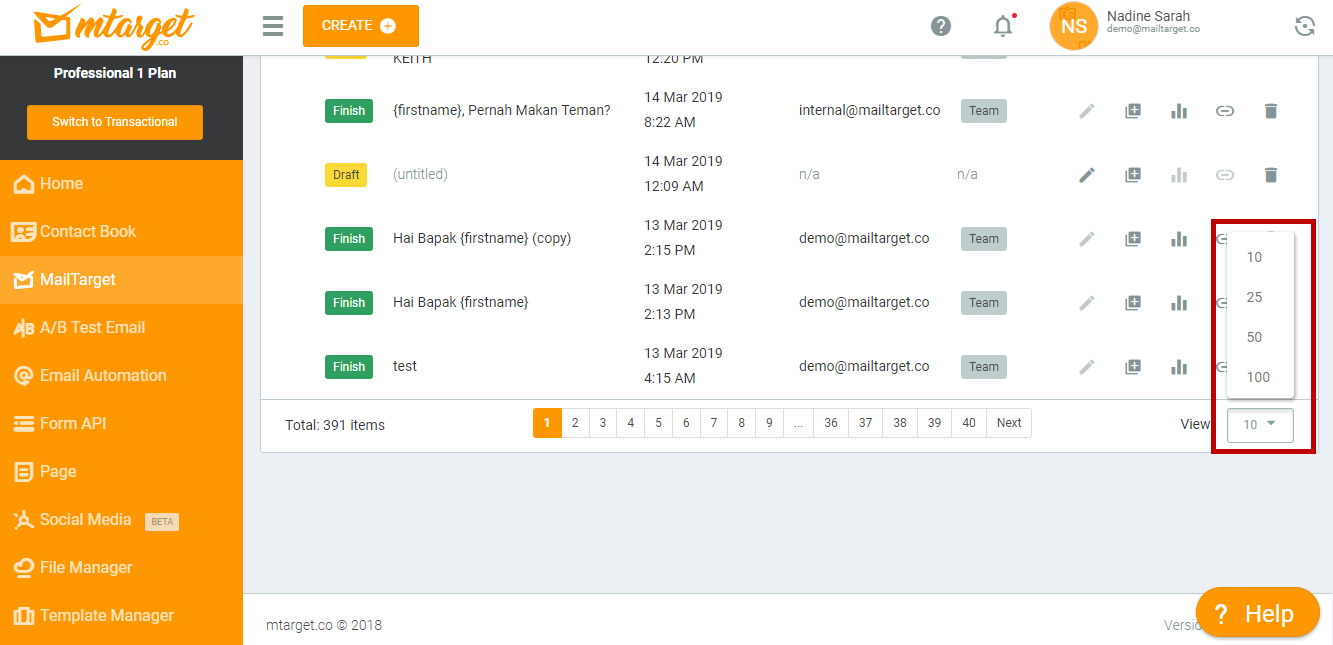 The custom pagination feature can be seen in the list of contacts, emails, pages, or forms that have been created. At the bottom of the list, you can set the number of items you want to display. In the drop-down view, you can select the number of items to display (10, 25, 50, or 100).