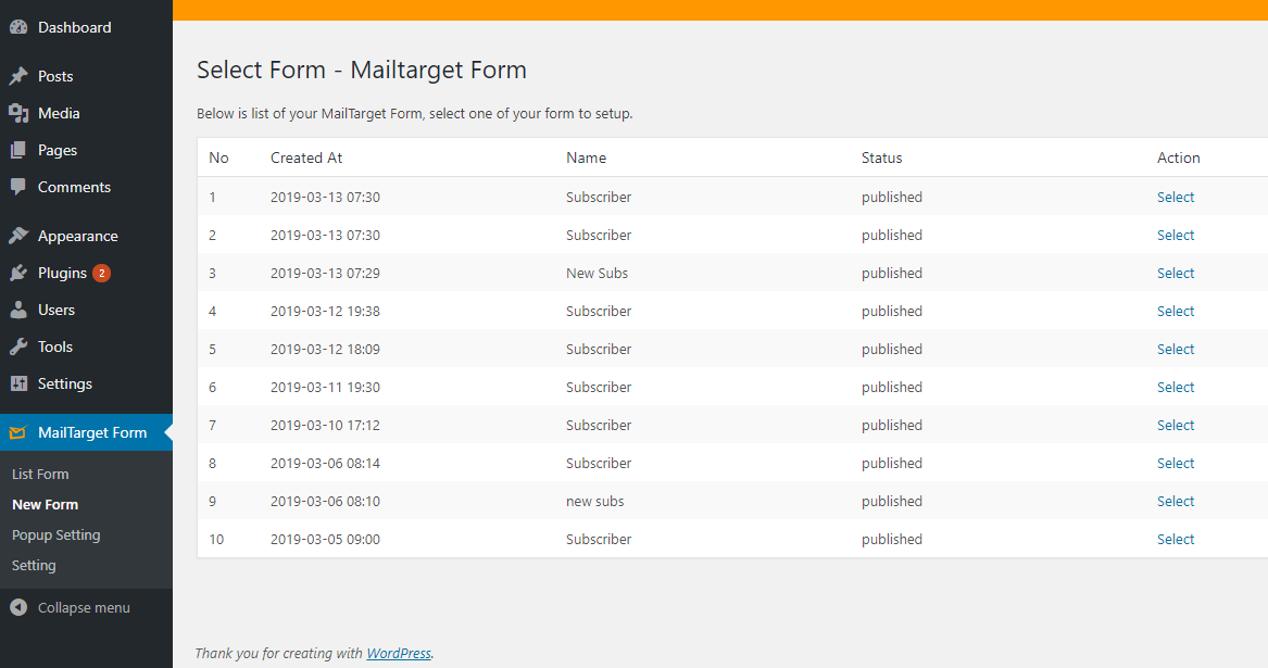 June 4, 2018 Form Plugin on Wordpress With this feature, you can select and install any form you have created on MTARGET in Wordpress.