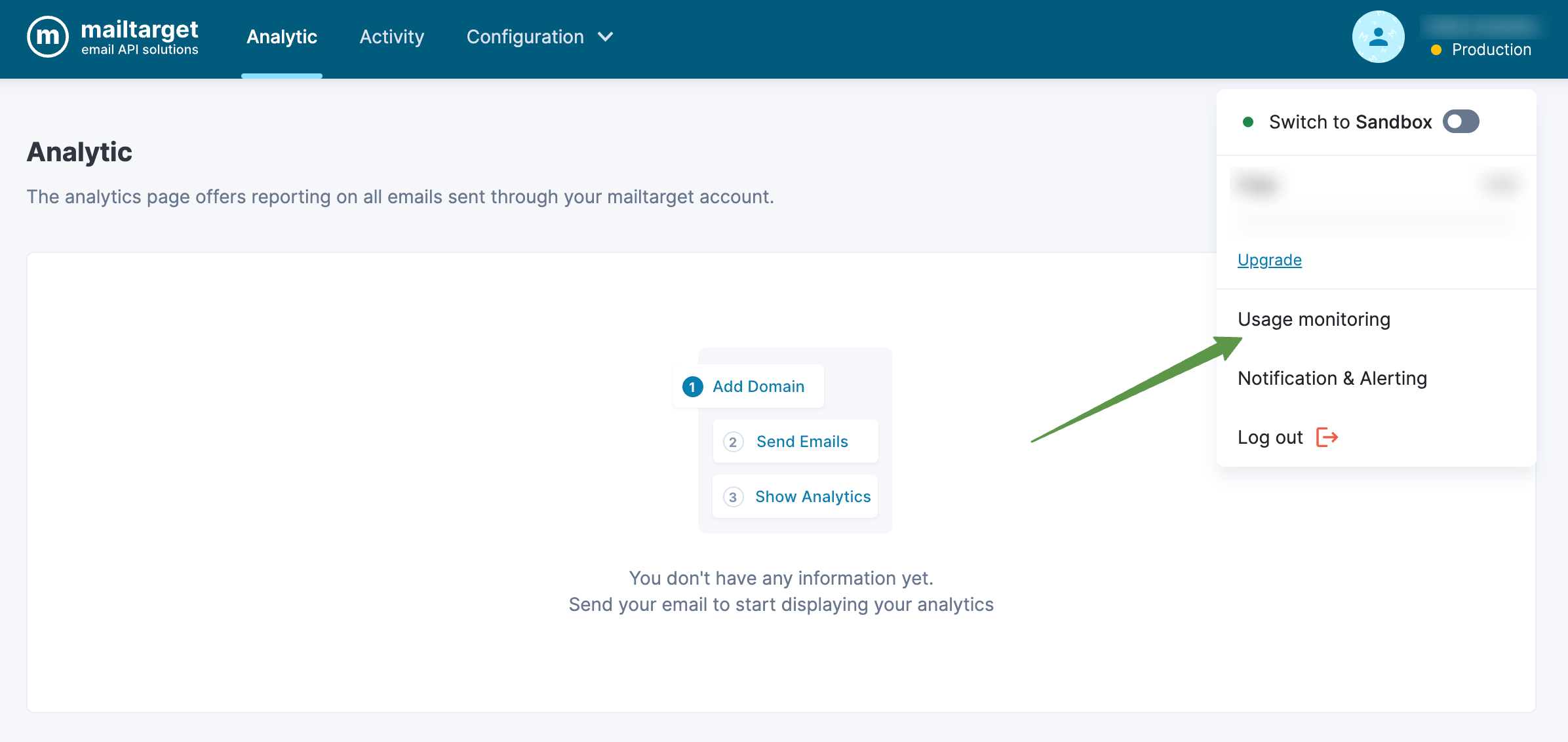 Usage Monitoring in Mailtarget is the process of tracking email usage and analyzing how your Mailtarget account is being used.