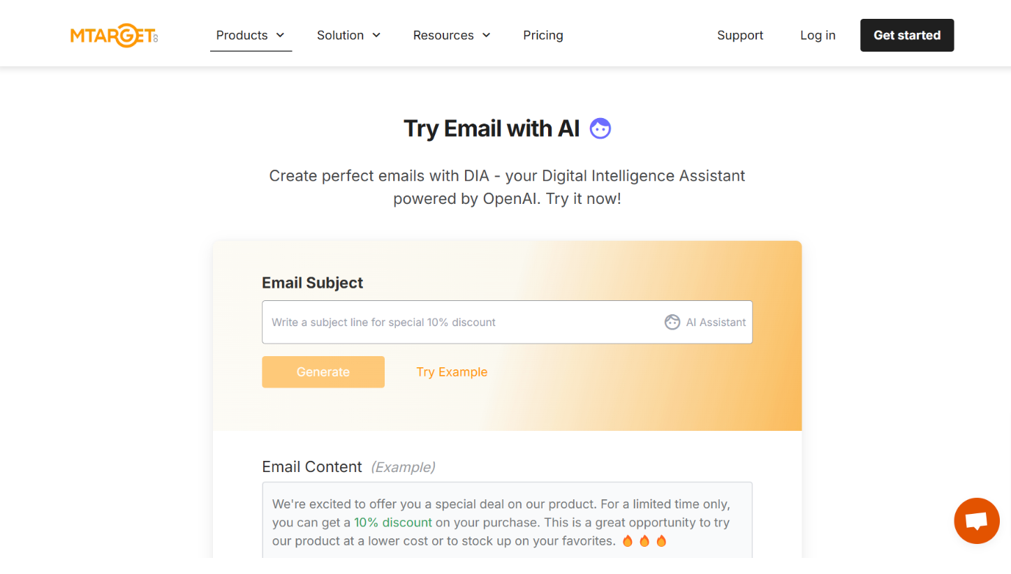 To try out this DIA mini generator, visit mtarget.co and click the "Write Email with AI" button.