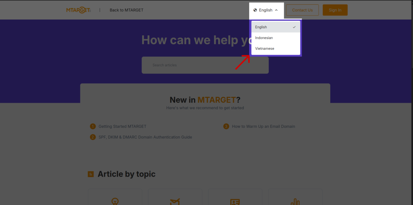 At the top of the page or from the language menu, select the language you want from the available options (Indonesian, English, or Vietnamese).