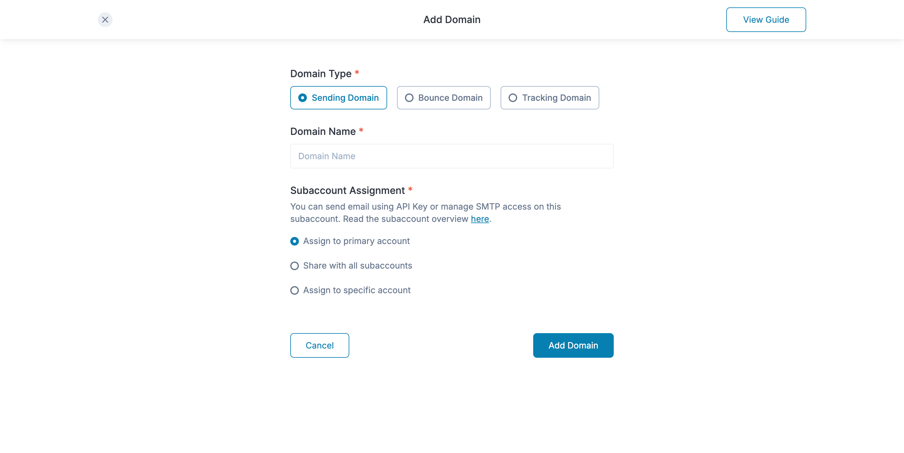 After filling the domain name, you can assign the domain into primary account or subaccounts, then click Add Domain button
