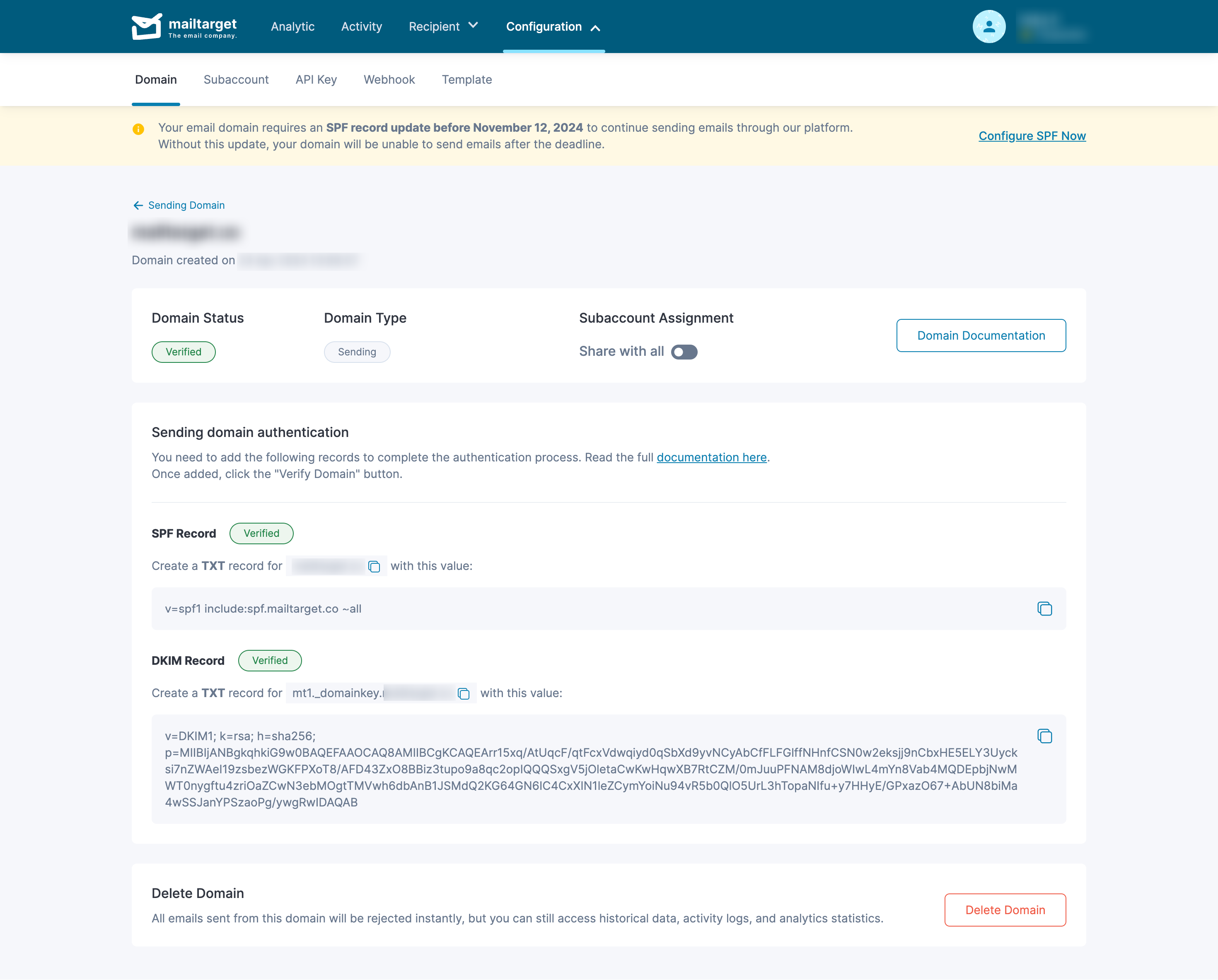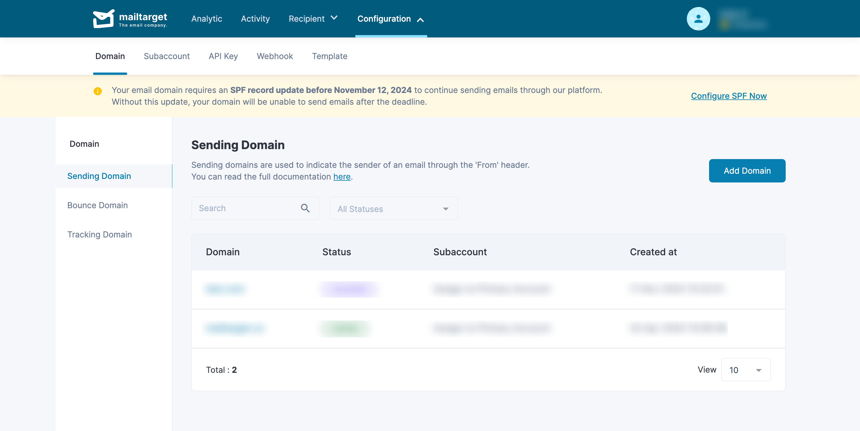 In order to add your sending domain to the Mailtarget, you must open the Configuration > Domain > Sending Domain menu then click Add Domain button and fill your domain name.