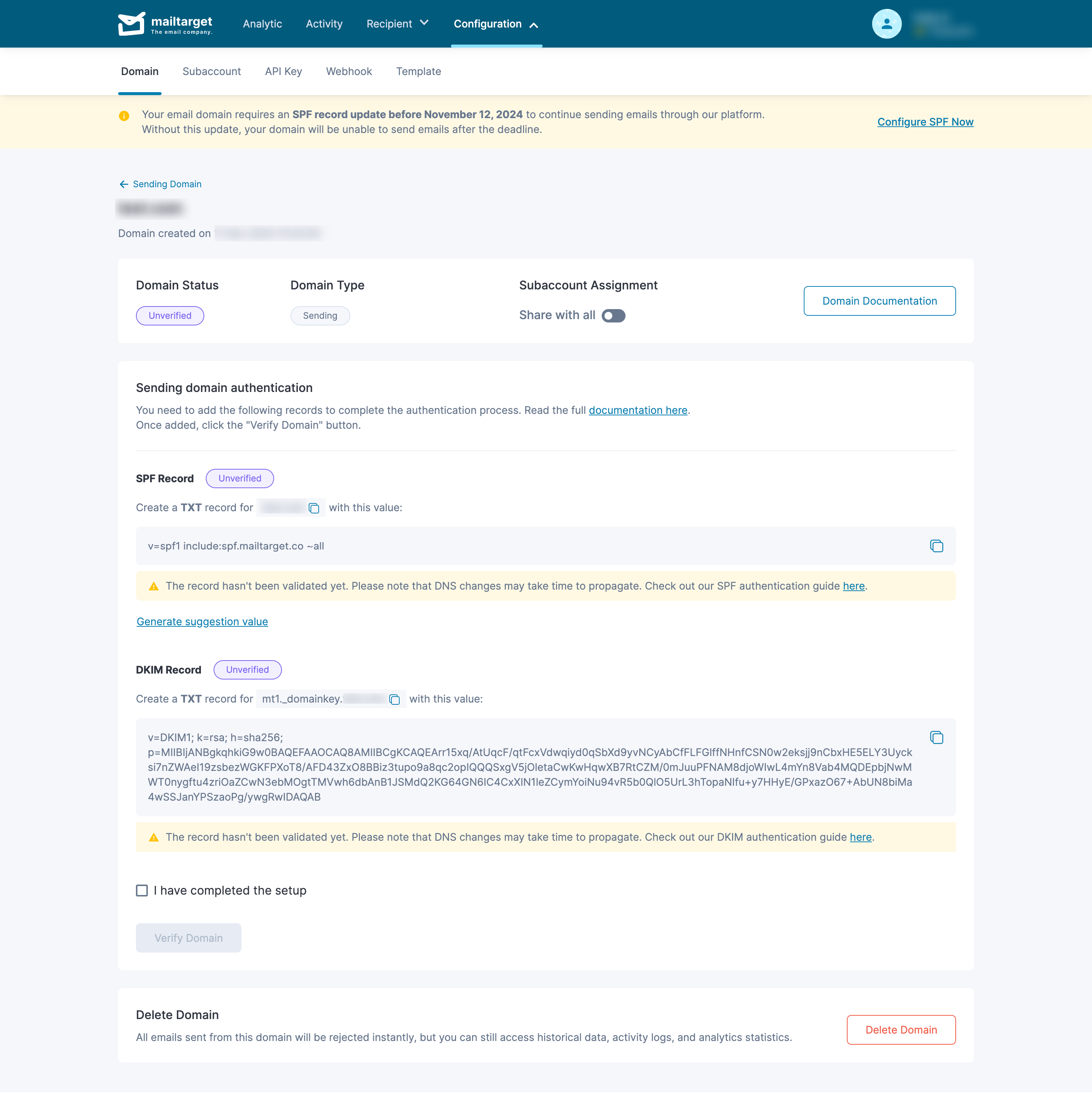 - After your domain has been propagated properly, check the I have completed the setup then click Verify Domain button.