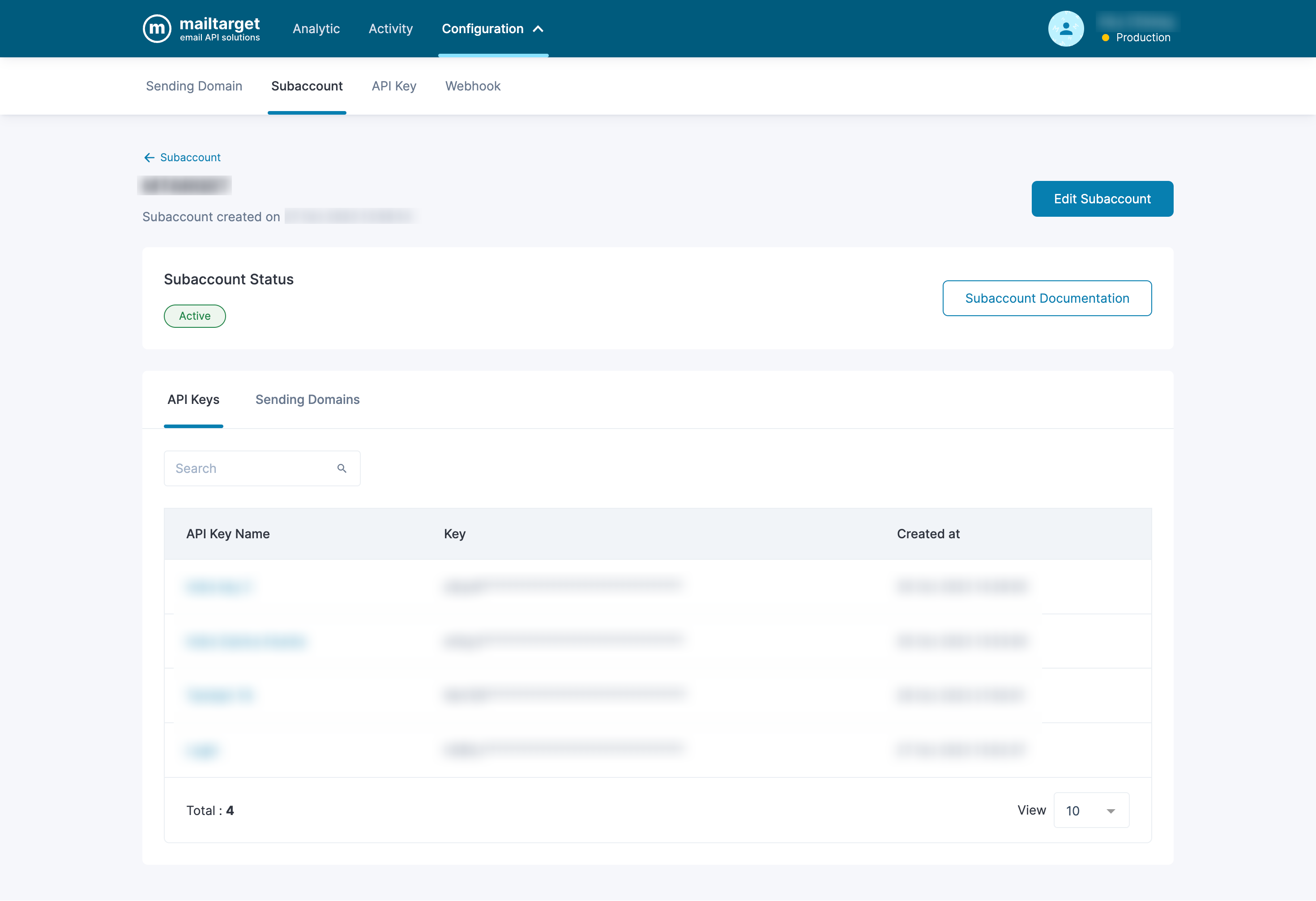 After the subaccount is created, the user can check the details of the subaccount by clicking on the subaccount name, the user can see the subaccount status, details of the API key and sending domain assigned to the subaccount.