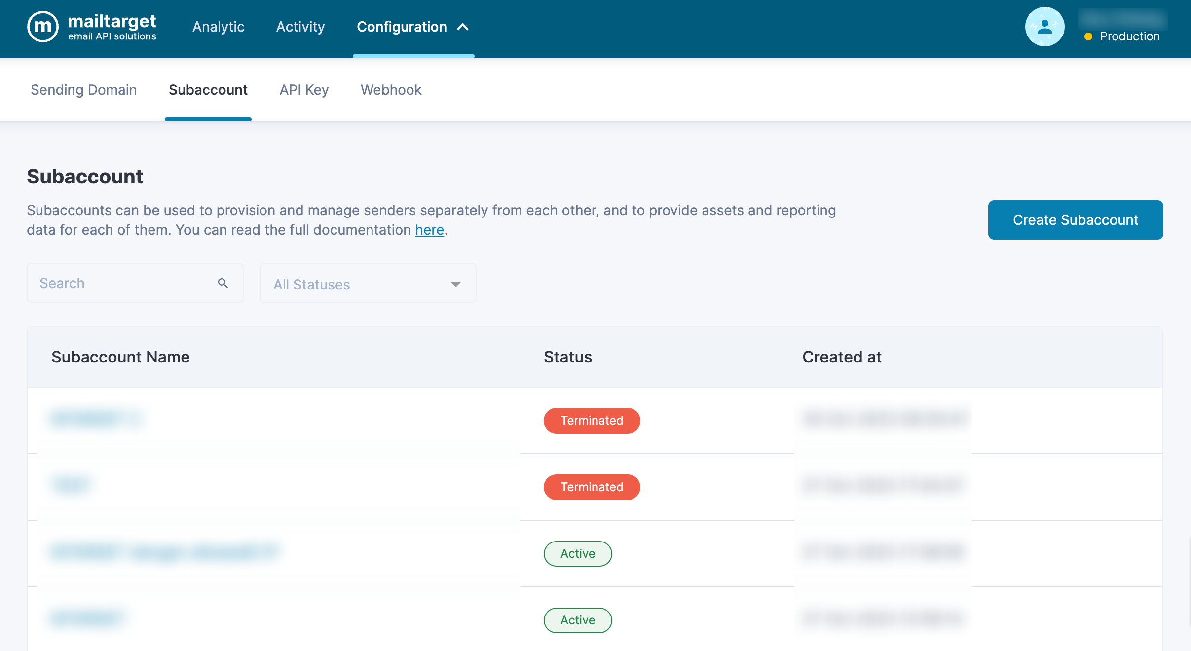However, in the production environment of Mailtarget, subaccounts are fully supported and readily available. Subaccounts serve as a valuable tool for organizing and managing email flows effectively. They allow users to create additional linked accounts, enabling seamless segmentation and control of email communication.