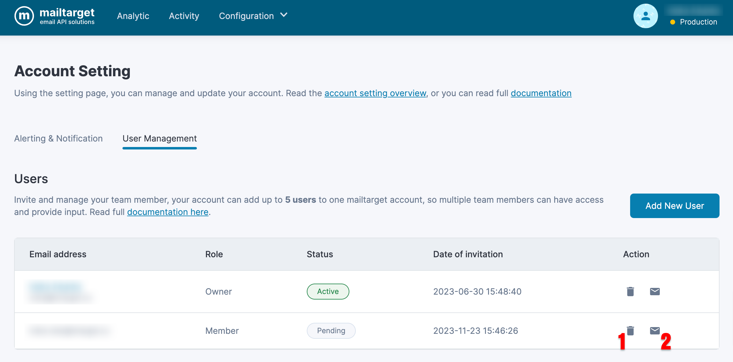 If you want to delete a user, click the delete icon on the dashboard indicated by number 1, then you will be asked to confirm user deletion. If you want to resend the verification email, click the resend icon shown in number 2.