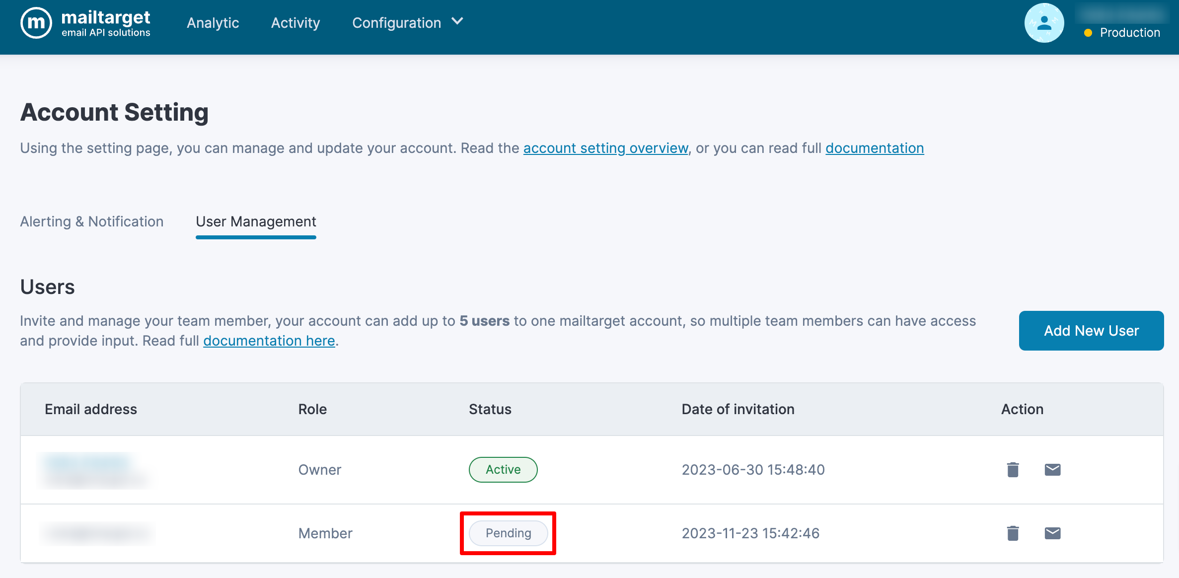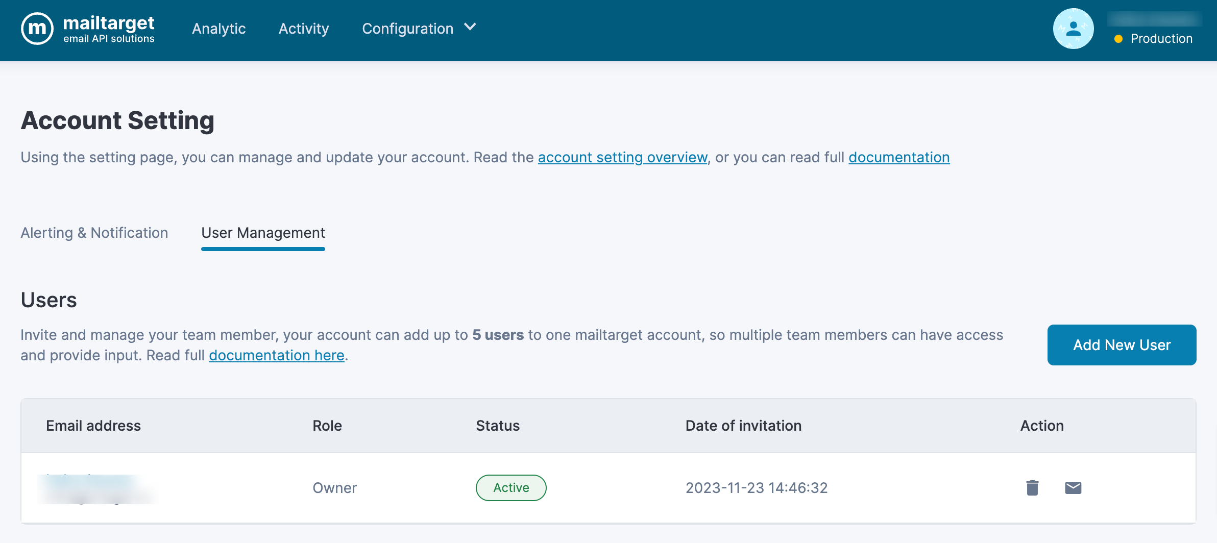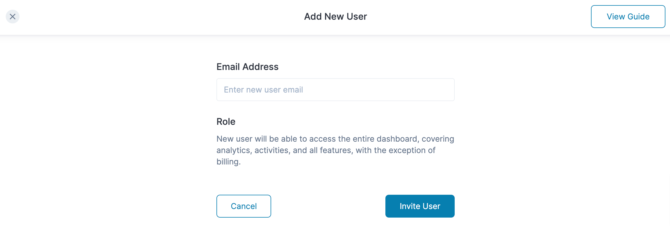 If you are the account owner and want to add a new user, click the Add New User button. Enter new user email address to give them access to your Mailtarget dashboard.